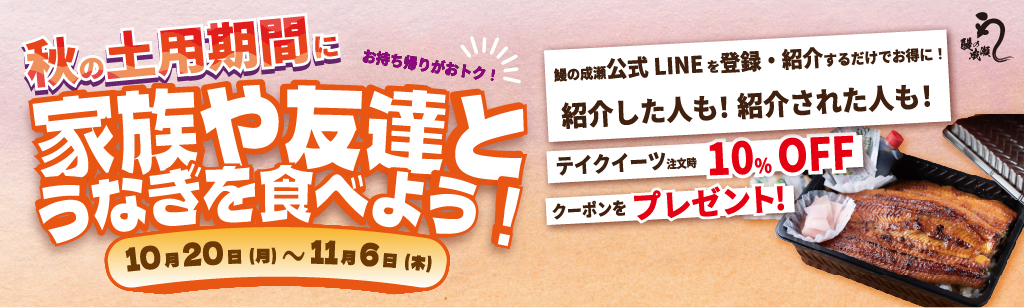 2025年10月20日(月)〜 11月6日(木)の秋の土用期間限定で、「鰻の成瀬」では テイクアウト10%値引きキャンペーンを実施いたします。